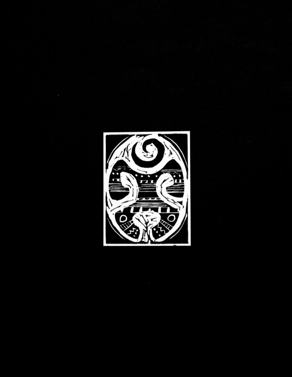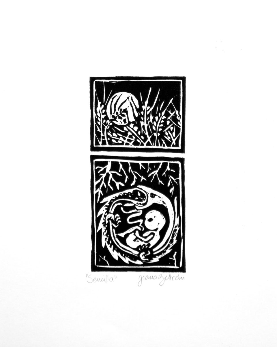 Dentro de la serie aparece también un grabado relacionado con la toma de yagé, construido a partir de una experiencia personal. Esta imagen se distancia de una representación literal del ritual y se sitúa más bien en el terreno de lo sensorial y lo psicológico: la disolución del cuerpo, la alteración de la percepción y la confrontación con lo interno. El grabado funciona aquí como un espacio de tránsito, donde lo visible y lo invisible se superponen.