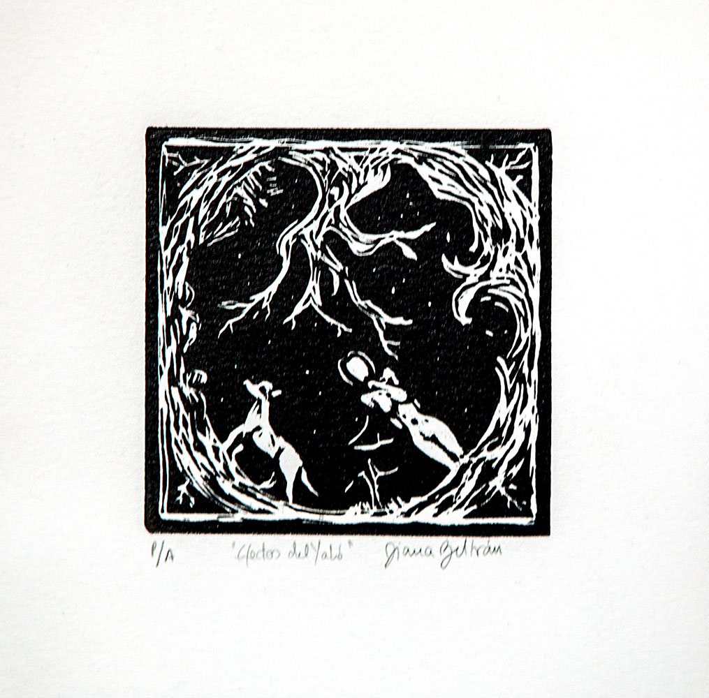 La serie se completa con grabados inspirados en relatos y cuentos del Amazonas, que aparecen como fragmentos narrativos y referencias a un territorio cargado de mito, oralidad y conocimiento ancestral. Estos relatos no se ilustran de manera directa, sino que se filtran en las imágenes como atmósferas, símbolos y resonancias, ampliando el campo de lectura de la obra.