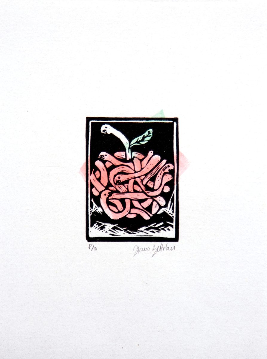 Otras imágenes introducen elementos simbólicos y narrativos, como una manzana construida a partir de lombrices, que remite a la descomposición, lo orgánico y lo que habita debajo de la superficie. Esta imagen dialoga con la idea de lo aparentemente puro o deseable que, al ser observado de cerca, revela procesos de putrefacción y vida simultáneamente.